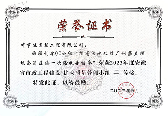 中節(jié)能國禎工程公司QC小組編寫的《提高污水處理廠鋼筋直螺紋套筒連接一次驗(yàn)收合格率》憑借圖文并茂、邏輯性強(qiáng)的特點(diǎn),在眾多成果中脫穎而出,獲“優(yōu)秀質(zhì)量管理小組二等獎(jiǎng)”的優(yōu)異成績,這也是工程公司首次取得該項(xiàng)榮譽(yù)。