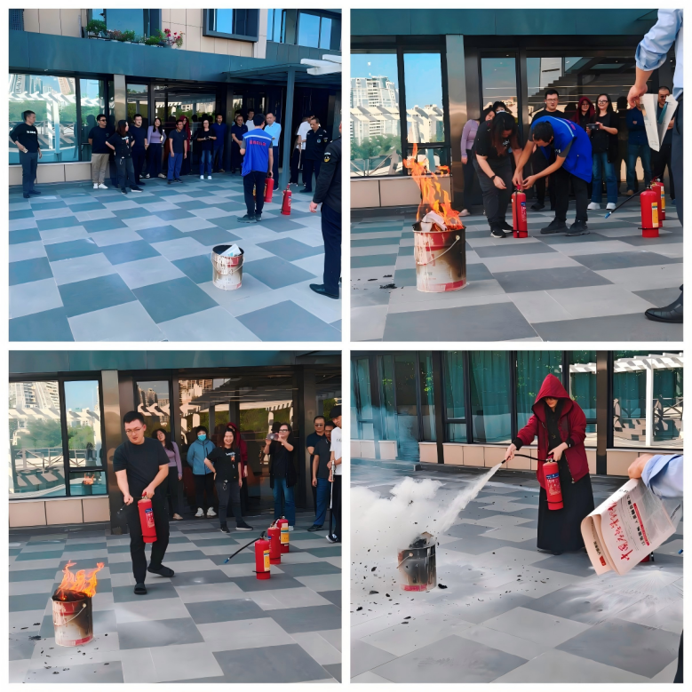 培訓結束后,現場模擬了辦公樓火災險情,立即啟動消防應急疏散演練。應急指揮部快速響應,各小組協同配合控制火勢,各單位兼職消防員高效指引職工安全撤離。在滅火實操環節,專業人員現場做滅火示范并指導職工撲滅真實火源,強化實操技能。