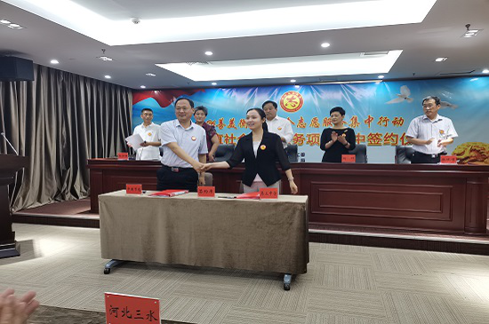 為履行央企社會責任,服務地方教育事業,助推志愿服務事業發展,2021年6月26日,中國環保衡水公司在衡水市直工委組織的志愿服務項目簽約儀式上與衡水市第三中學、第四中學、永安路小學、新苑小學、勝利小學五家學校簽訂了志愿服務協議書。衡水市委宣傳部、市直工委、民政局、教育局、城市管理綜合執法局的主要領導共同參加了此次簽約儀式。