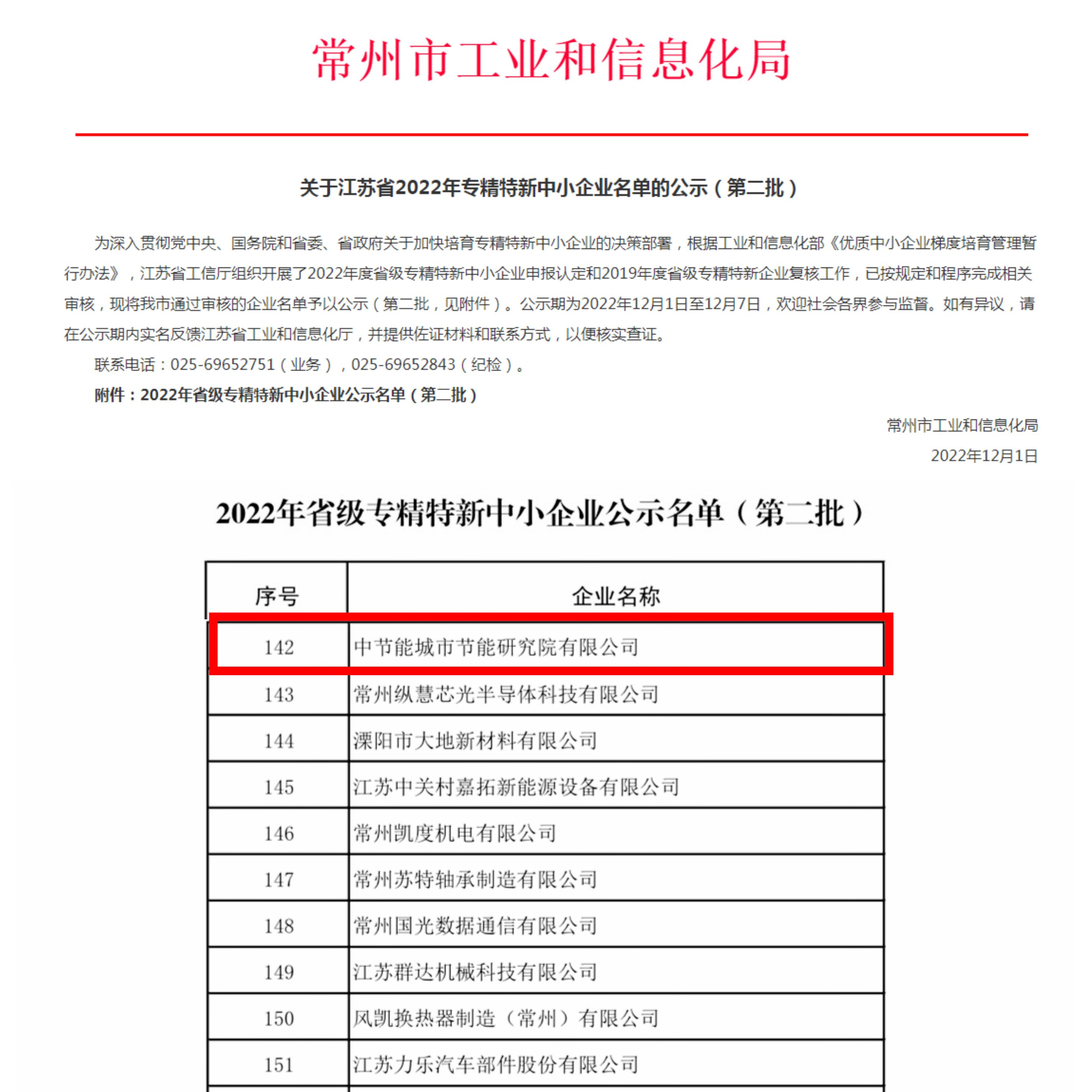 12月1日,江蘇省工信廳完成2022年度省級專精特新中小企業認定,中節能城市節能研究院有限公司成功入選“2022年江蘇省專精特新中小企業”。