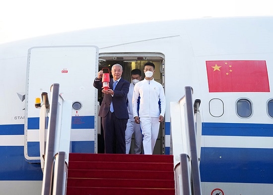 10月20日,在北京首都機場,北京冬奧組委特別代表、北京冬奧組委副主席于再清(左)手持火種燈走出艙門。隨著北京冬奧組委赴希臘代表團抵達首都機場,北京冬奧會火種順利抵達北京。新華社記者 張晨霖 攝
